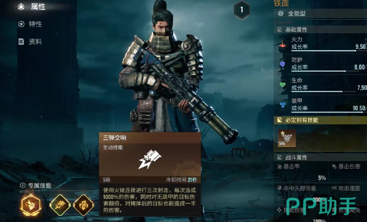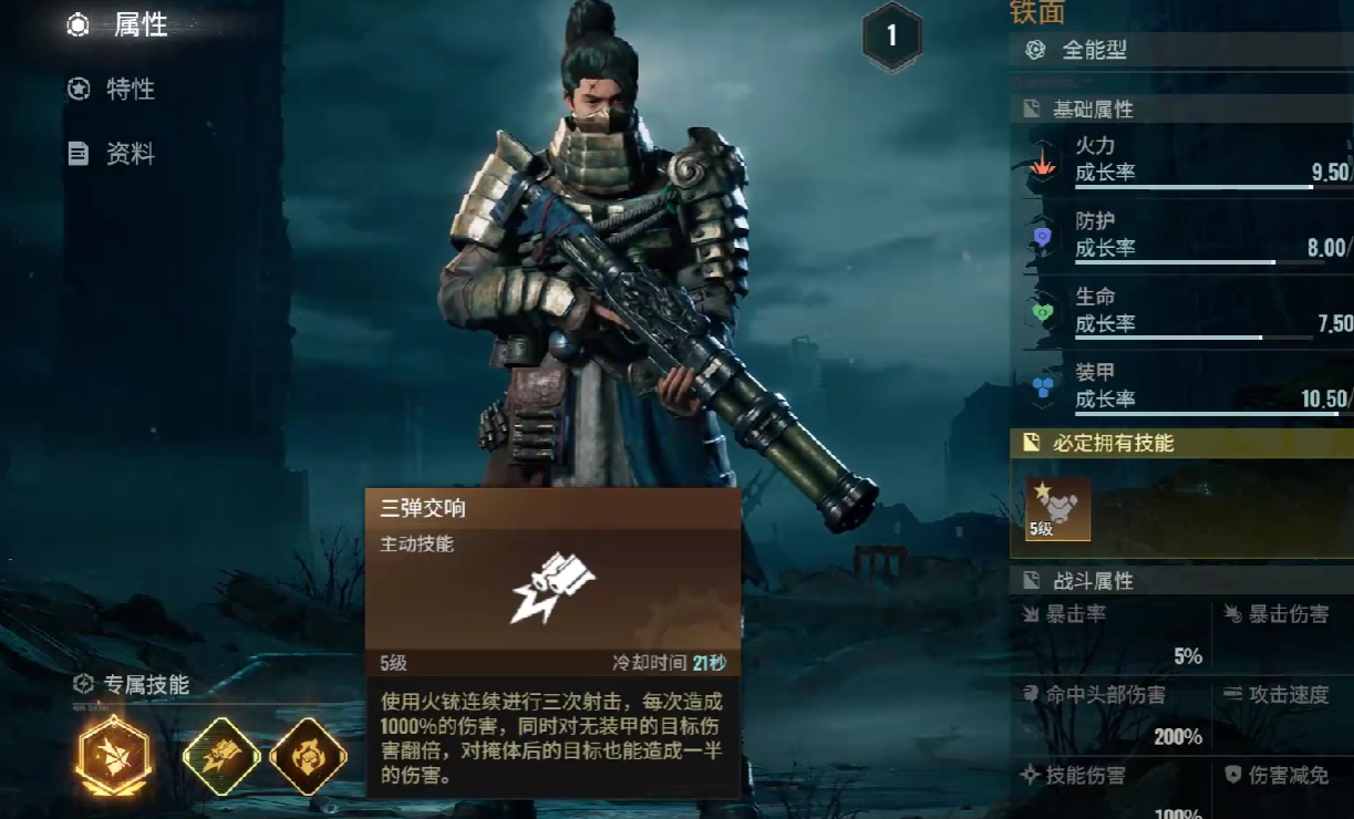 主动技能三弹交响,在使用火铳连续射击三次后,单次伤害可以增长为,自身基础攻击倍率的280%,如若目标没有穿戴任何护甲,那么伤害会进行翻倍,但倘若目标处于掩体之后,仍然可以造成基础攻击倍率,提升50%的伤害数值,对清理杂兵而言,该技能有着强效。