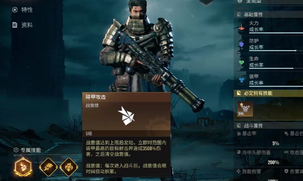 铁面的核心技能,分别有这三个,首先是战役技能碎甲攻击,触发条件是战意值满后自动释放,对于周围的目标装甲,最高可以造成倍率为3500%的伤害,针对重装敌人而言,有着很强的压迫能力。