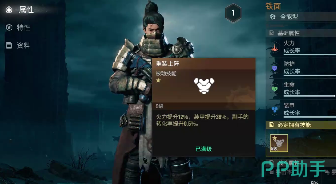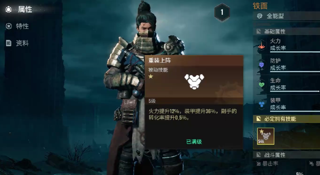 第三个技能属于被动技能,它的名字叫做重装上阵,如若玩家将铁面设置为自己的常驻角色,可以提升基础防御数值36%,并且能够增加基础活力。