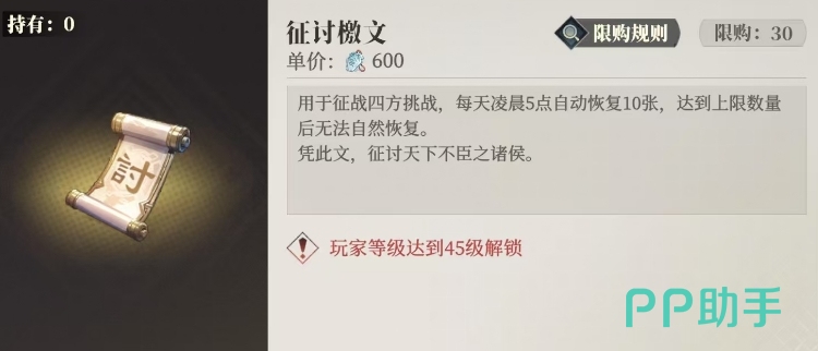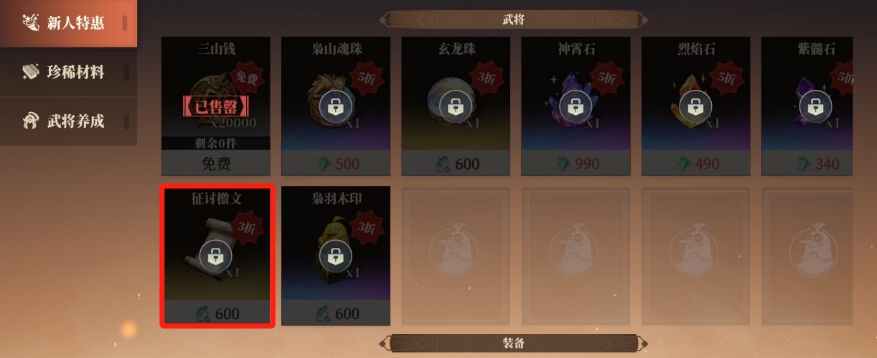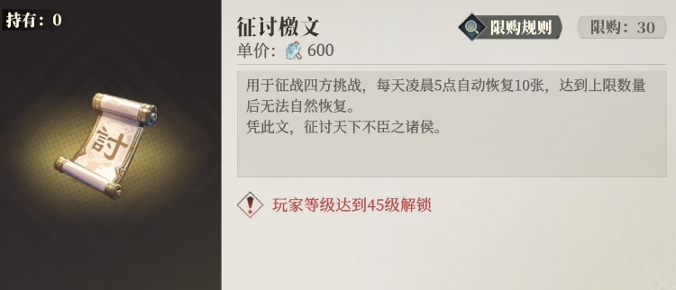 游戏中除了通过游戏商店进行购买之外也有其他的获取途径,就目前游戏商店的设置来看,里面有一个专门针对新人的特惠板块,玩家可以在这个板块中找到征讨檄文并进行购买,每张征讨檄文的价格设定为600苍岩山,而且为了保持一定的稀缺性,每个玩家在这里的限购数量是30张。
