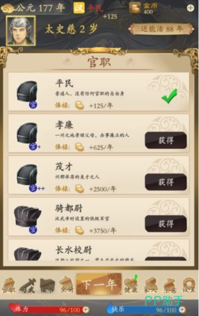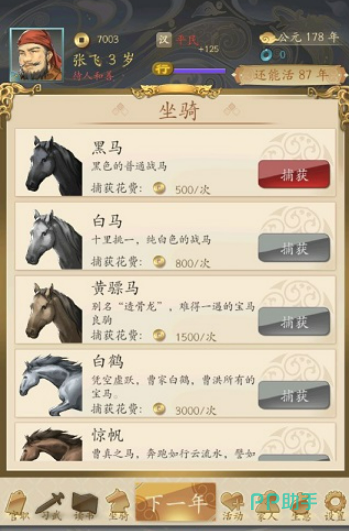 而晋升的过程就像是一场无止境的竞争,从平民到贵族,从基层官员到朝廷重臣,几乎每一步都充满了挑战。你从第一年起,就可以尝试申请官职,每年固定领取150铢的工资。成长之路并非一帆风顺,你不仅要提升个人的能力,连“马匹”也成了晋升的重要工具。最初,你可能只能抓到普通的黑马或白马,但随着游戏的发展,你将有机会抓捕如赤兔、绝影等传奇良驹。这些马虽然无法提升属性,但却是晋升过程中不可缺少的条件。每次抓马的费用也会逐步增加,失败的概率也不低,想要成功升职,你得拥有一匹好马,还得要花心思去抓捕它。