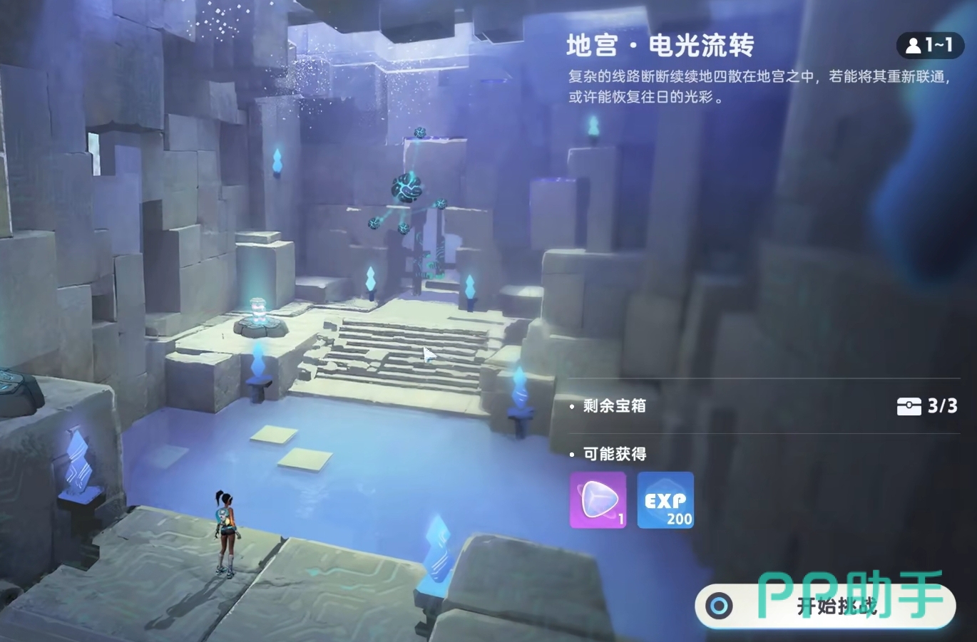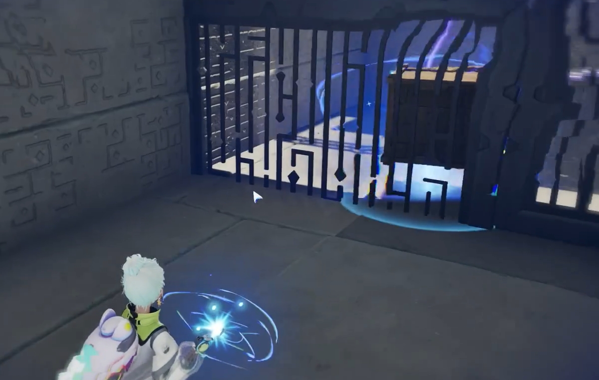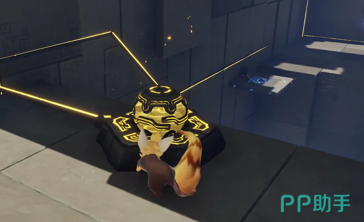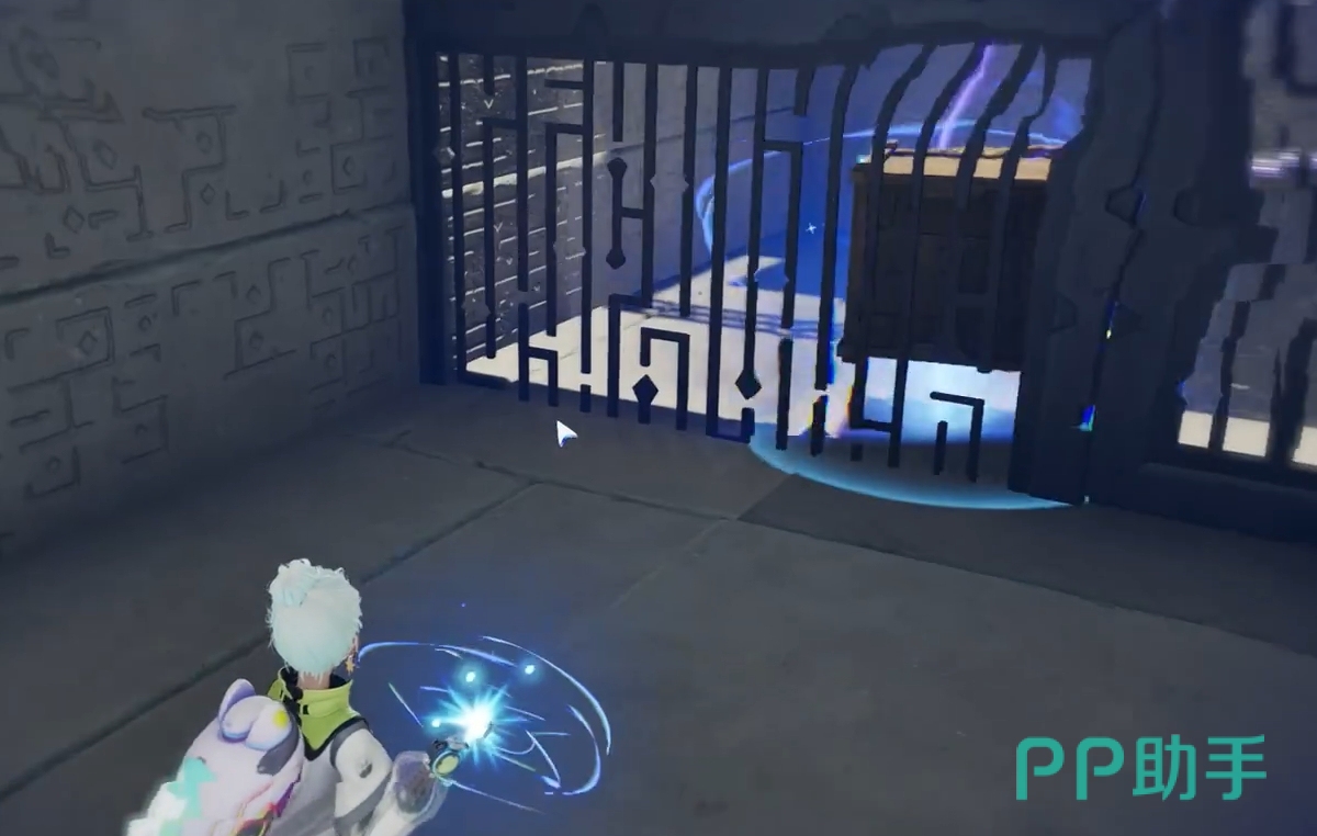 该地宫坐落于闪电之森正下方。初始区域中,中央电路明显断开,两个裸露节点之间被一只木箱阻隔。此时需操作近旁的紫色电箱,将其推撞木箱使其移位,随后精准将电箱安置于两节点正中,完成导电回路——前方闸门随即开启。首个宝箱就藏于该紫色电箱后方隐蔽位置,拾取后即可进入第二关。