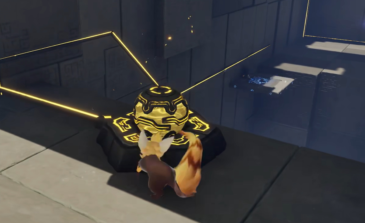第二关入口处需先与机关交互,唤醒伙伴伊莫;随后携其登上悬浮平台,抵达后方区域并进入联结状态,对目标机关发起攻击以完成充能,从而激活下一段空中路径。继续跃至末端区域后,将镜头转向右侧深处,可发现另一待充能机关,同样通过攻击完成激活。此时暂不急于解谜:退出联结后,操控电箱将其置于大门右侧平台正下方,借力跳跃登顶,开启第二个宝箱。落地后,再将电箱移至大门正前方靠墙的电路节点上,通电即刻,本关挑战宣告完成。