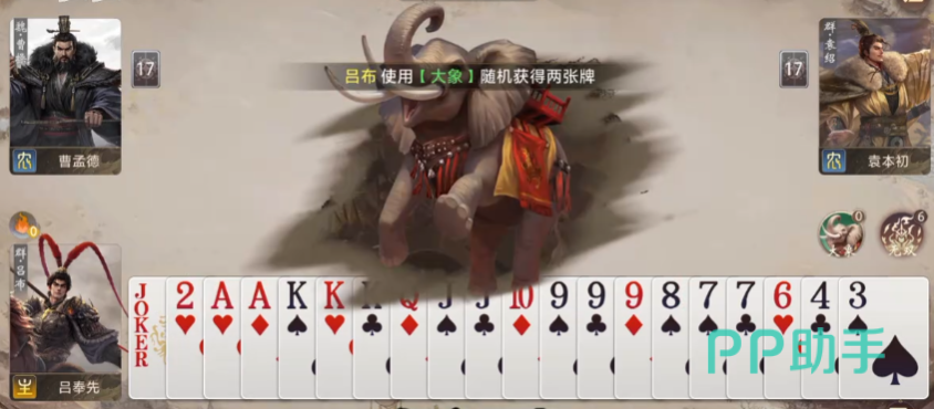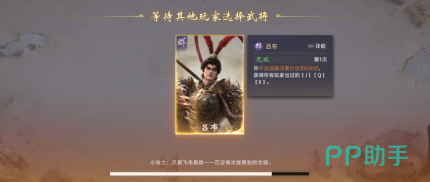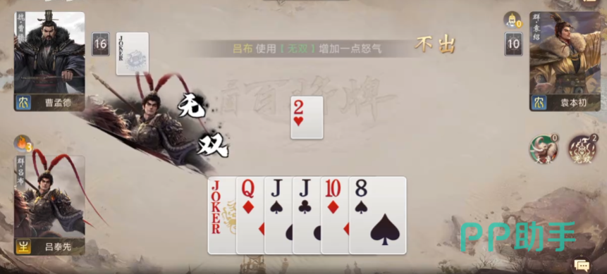 要有效应对吕布,首先必须掌握他的核心技能规则。每当玩家出牌被压制,或轮到你压制他人却选择放弃时,吕布便会积累1点怒气。一旦怒气值达到6点,他将回收全场已打出的所有J、Q、K牌,形成极强的后期爆发能力。这里所说的“被压”指的是你的牌被对手更高组合覆盖,“让压”则是指面对别人出牌时你具备压制能力但选择不出手。这两种情况都会为吕布提供怒气增长机会。因此,在对抗过程中,有两种可行策略:一是在吕布怒气未满6点前迅速结束战斗;二是控制场上大牌释放节奏,避免让他获取过多关键牌型。