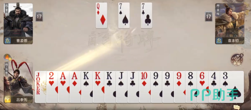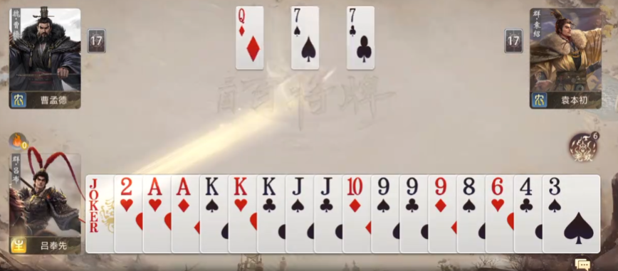 部分玩家可能因局势紧张而贸然使用小炸弹强行打断,但这反而会助涨吕布实力——因为三张勾(即三连对)若落入其手,再结合原有的三张圈(三张相同数字),将极大增强其反打能力。此时即便你能压制,也可能导致失败。因此更稳妥的做法是放弃压制,保留出牌权等待队友支援。若队友能够接管局面,吕布虽可能刚好攒够6点怒气拿回J、Q、K,但仍存在翻盘空间;若队友也无法应对,则可在后期手牌减少的情况下,依据明牌信息灵活调整策略。