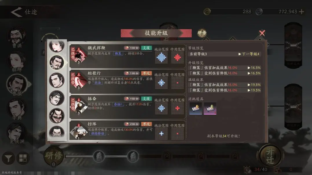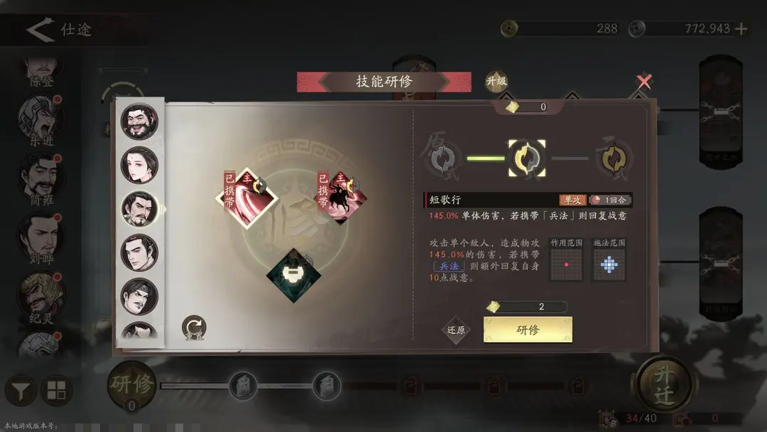 若想完全激活曹操的核心能力,需同时推进两条仕途路线:群雄线解锁关键增益技能,重骑兵线则赋予其光环特性。“短歌行”为其初始计策,可对敌方造成伤害,研修后额外附带战意回复效果;“振奋”为轻骑兵线起始技能,能使我方单位获得“昂扬”状态,使全体伤害提升17%。