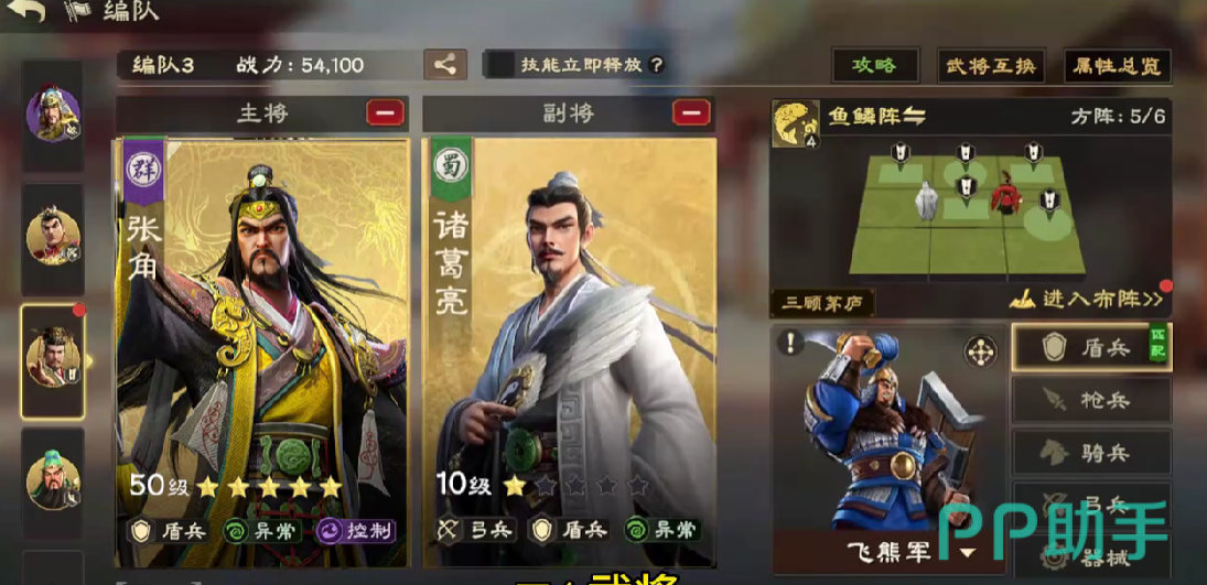 军阶盾兵专精选择异常,可以提高部队的异常状态时间,等到了游戏后期以后,阵容在搭配上可以直接把刘备给换成张角,张角和诸葛五都有着恶搞二的异常伤害以及增伤的效果,搭在一起相辅相成可以组成T0等级的异常盾组合。阵法上以鱼鳞阵优先,鱼鳞阵可以提高部队的异常伤害和武将的回怒加成。