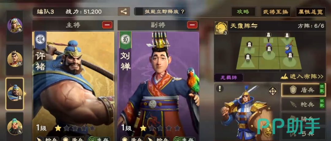 阵容上推荐以许褚和刘禅队组生存盾阵容,军阶盾兵专精选择生存,提高伤害抗性,游戏后期可以直接把刘禅换成刘备,许褚的高额防御属性,将会最大程度的把刘备的治疗效果给发挥出来,这两个武将组合在一起的堪称是战场生存的王者,在阵法上建议以天覆阵为主,没有天覆阵的话,可以用长蛇阵代替,天覆阵是很多盾兵的首选阵容,在生存盾这个阵容配置中,天覆阵搭配许褚的被动效果可以更好的维持全队兵力的稳定。