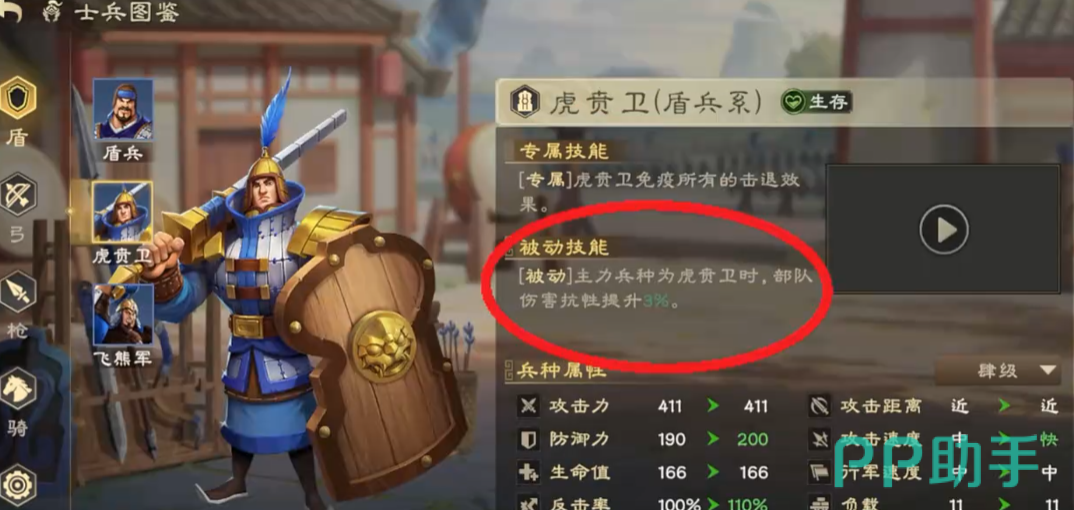 虎贲卫则是属于曹魏的一支比较精锐的不对,虎贲卫一直以来都是帝王的近卫队伍承担着保护帝王的重任,虎贲卫专属技能卫免疫击退效果,当助力部队兵种卫虎贲卫的时候部队的伤害抗性能够提升3%,比较适用于生存类的武将。