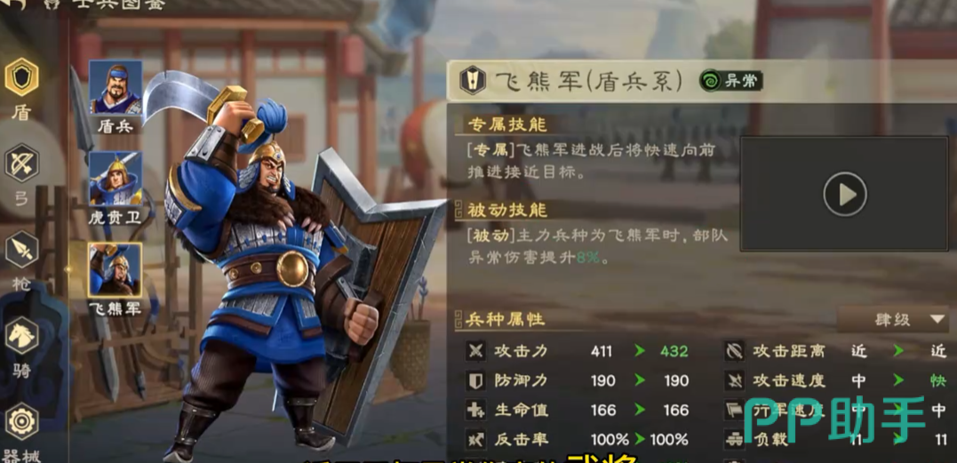 盾兵兵种其实只是一个比较大的类型划分,在盾兵兵种中又分成了不同的细小士兵类型,大体上盾兵兵种包含了飞熊军、虎贲军两种。