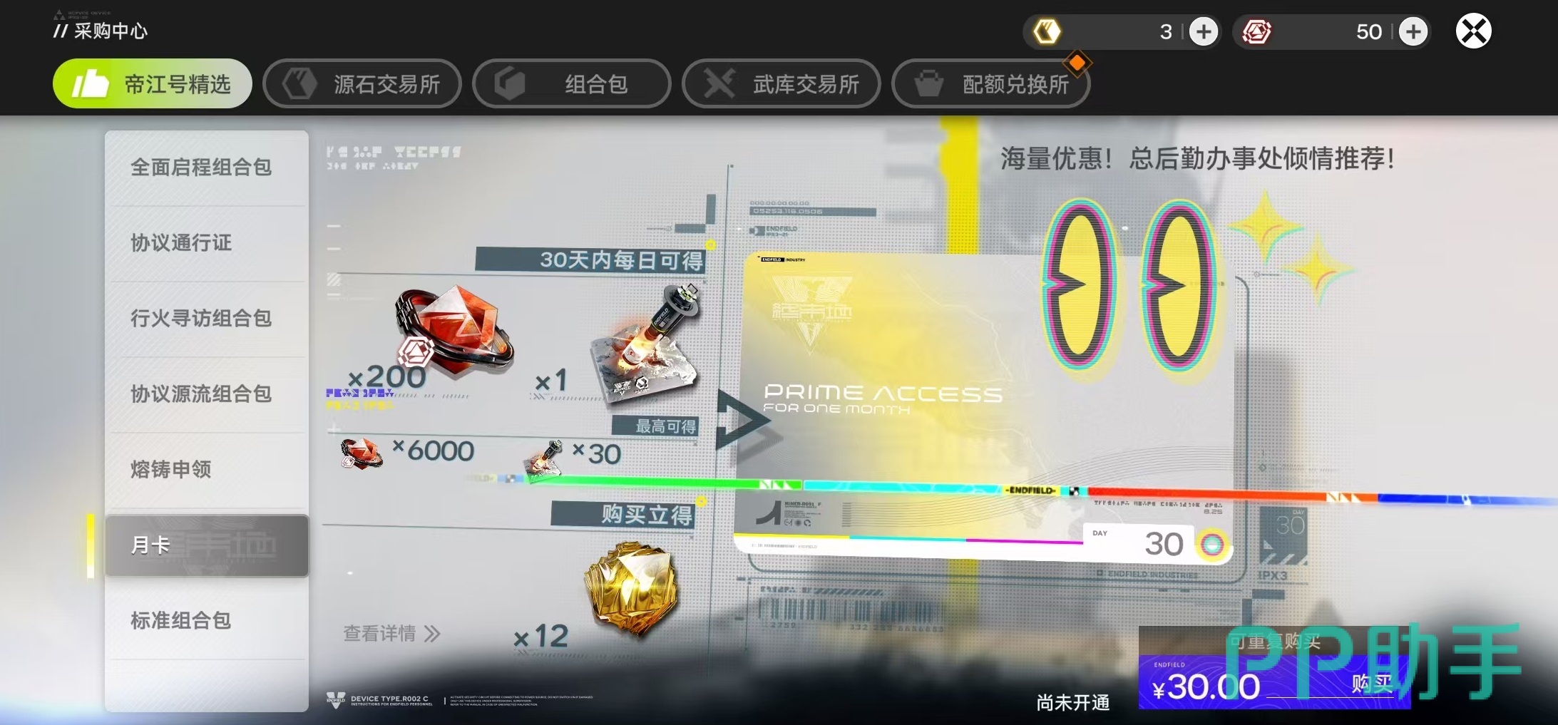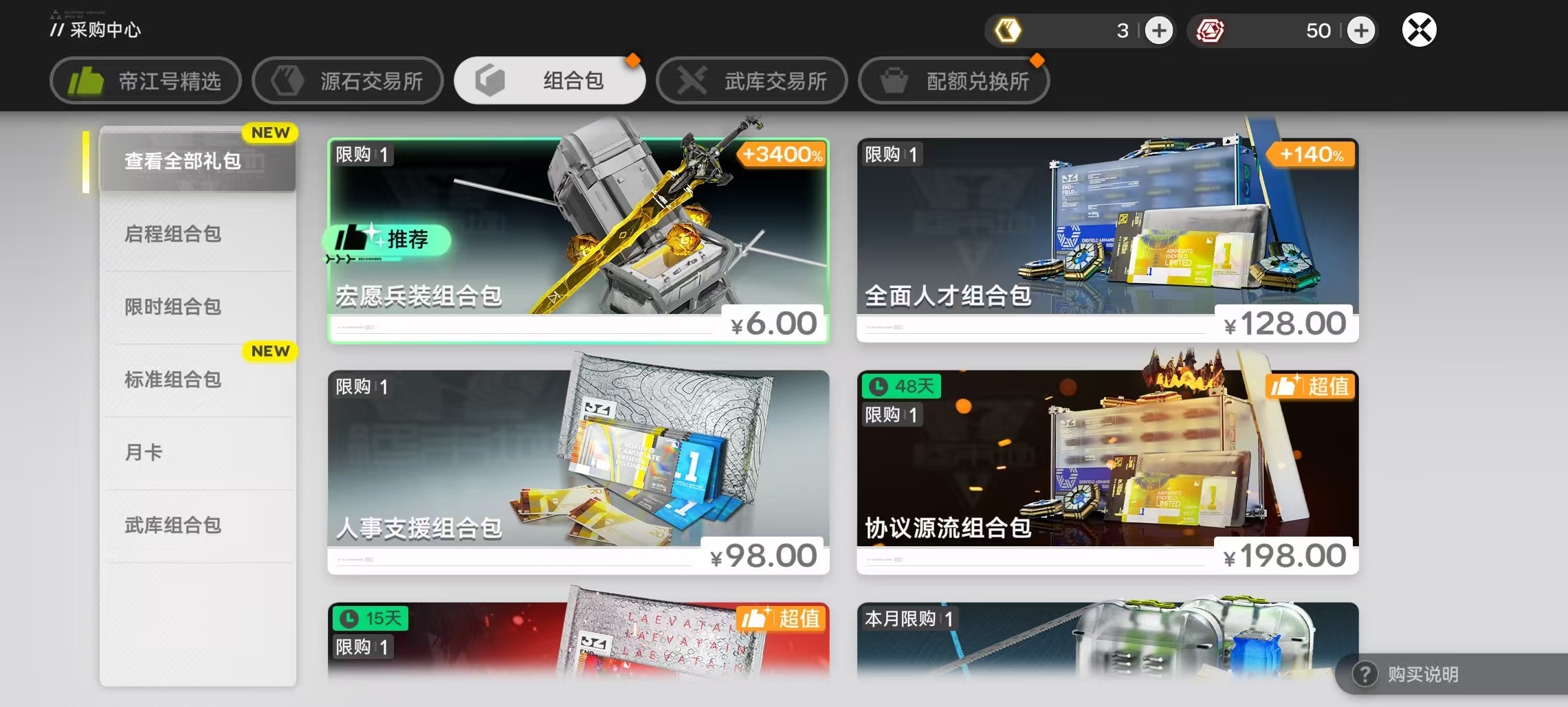 除上述核心项目外,采购中心内提供的多类主题组合包亦值得关注。例如宏愿兵装组合包、全面人才组合包(售价128元)、人事支援组合包(售价98元)等,虽单次投入金额较高,但所提供资源具有强整合性与成长加成效果。合理配置后,可在开荒期快速建立队伍成型优势,大幅降低中后期追赶压力,实现“一次投入,持续受益”的良性循环。
