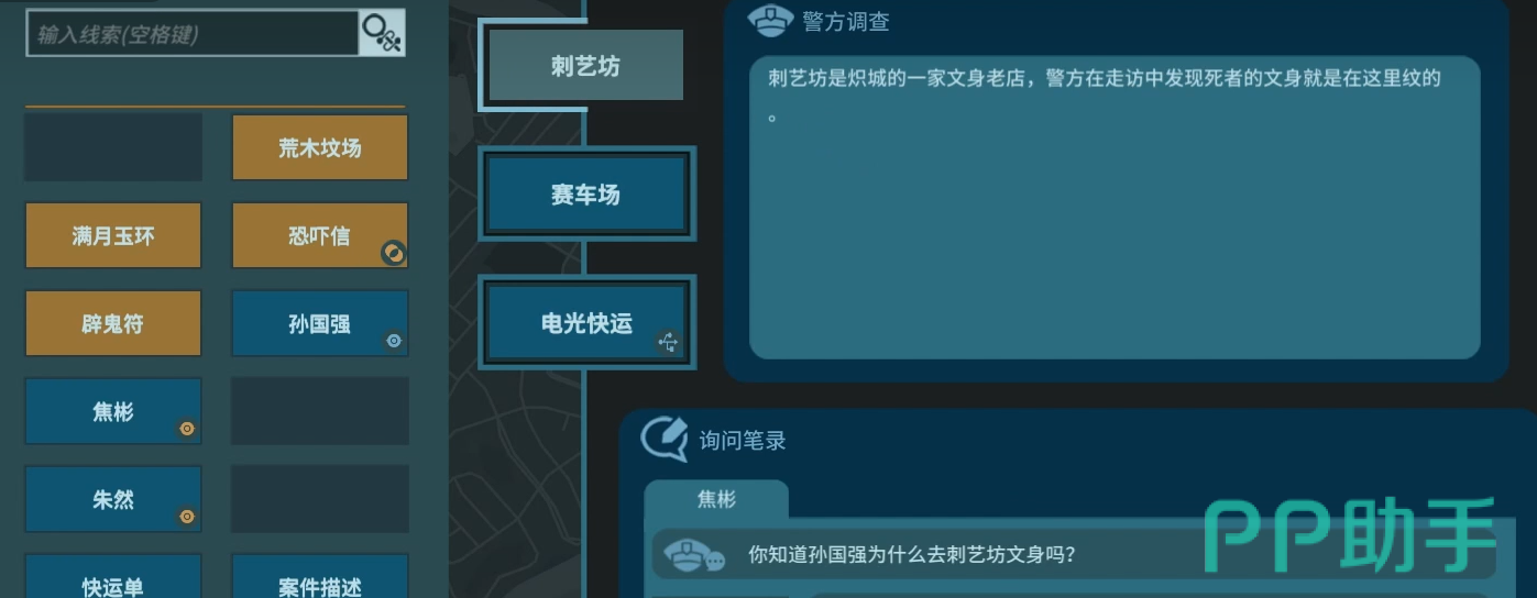 这个线索里将会告诉小伙伴们嫌疑人是焦彬,而死者则是为孙国强,通过线索的搜集大家将会发现“辟鬼符”、“满月玉环”和“恐吓信”等关键线索,这些证物是能够帮助大家找到凶手的重要线索,小伙伴们会发现“恐吓信”上的指纹与焦彬一样,通过焦彬的笔录大家会发现监狱与假药的线索,通过对这些线索的调查,大家将会发现背后的故事。