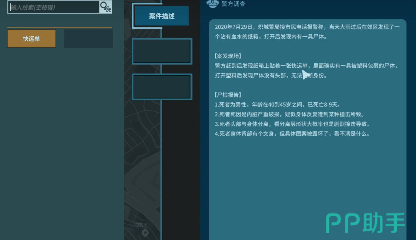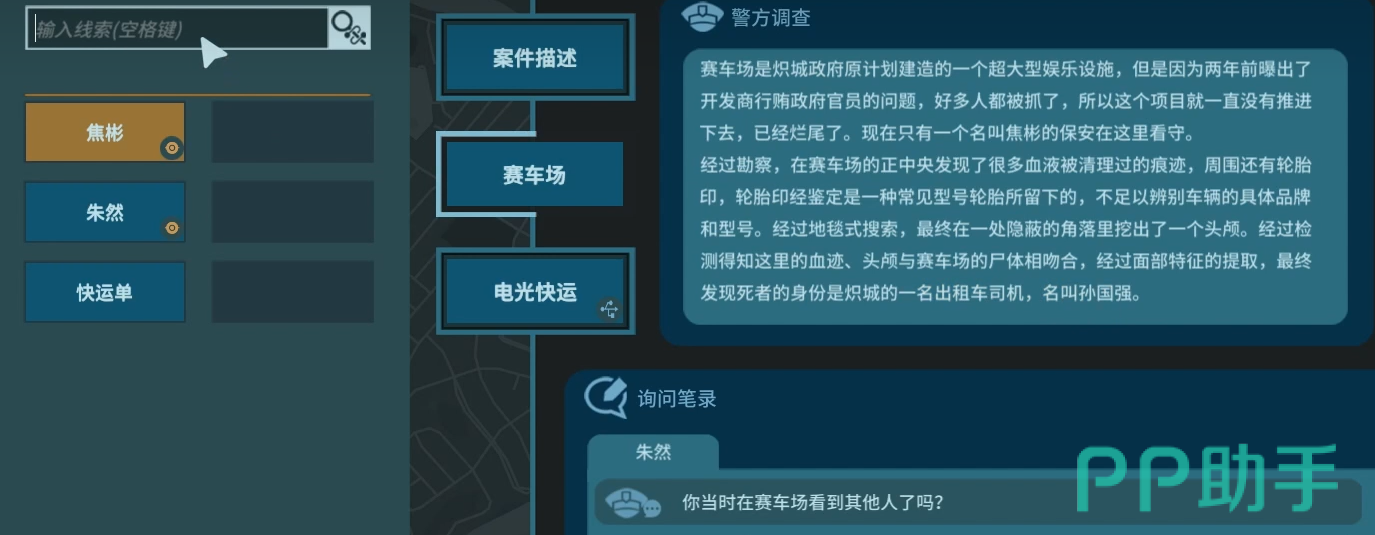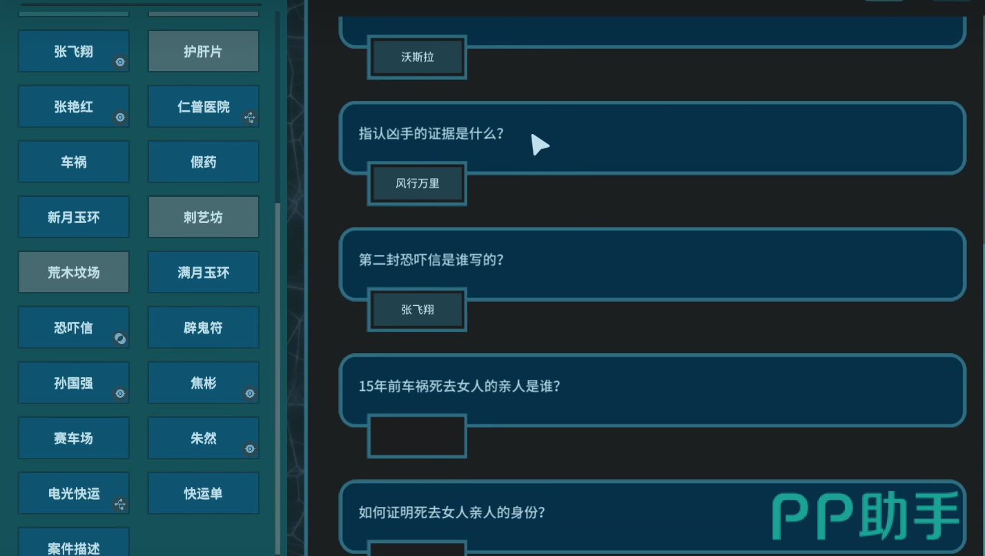 随后大家会发现刺艺访和荒木坟场,这个小伙伴们可以按照自己的想法任意进行探索,并不做强求,现在我们在来看恐吓信,借由恐吓信我们会发现沃斯拉轿车和风行万里公司的线索,然后根据笔录和死亡时间可以知道张飞翔就是驾驶员和凶手。