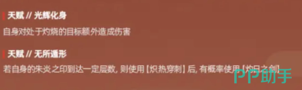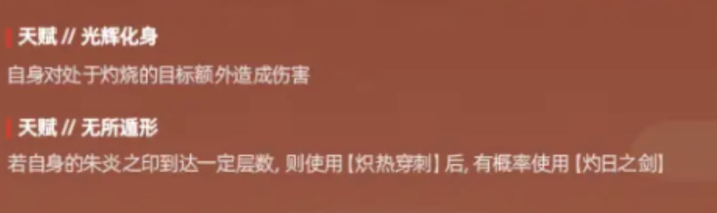 而她的天赋系统也值得一提。朝辉的【光辉化身】使她在面对灼烧状态下的敌人时,额外造成伤害,这意味着她对于灼烧状态的敌人有着独特的压制能力。而【无所遁形】这个天赋则让她的技能更加灵活多变。随着朱炎之印层数的积累,朝辉有机会通过【炽热穿刺】直接触发【灼日之剑】,为敌人带来更加致命的打击。