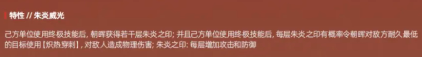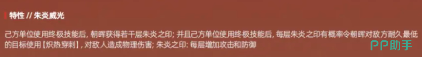 朝辉的特性【朱炎威光】可以说是她的核心优势所在。每当你的队友释放终极技能时,朝辉就能获得若干层“朱炎之印”。更重要的是,这些印记能够触发她的【炽热穿刺】,对敌方耐久最低的目标造成物理伤害,简直是一个稳定且强力的打击手段。如果你的队友释放终极技能后,再加上朝辉自身的朱炎之印效果,她能在战斗中不断积累攻击力,瞬间转化为强大的物理输出。