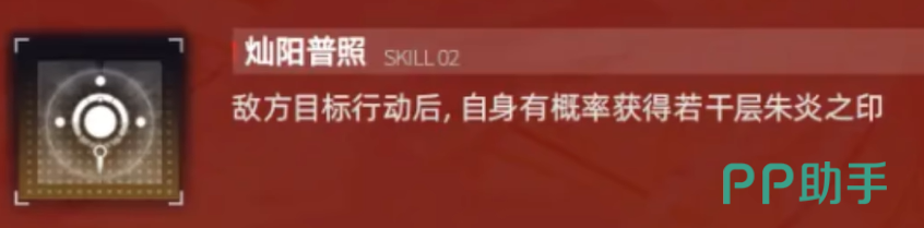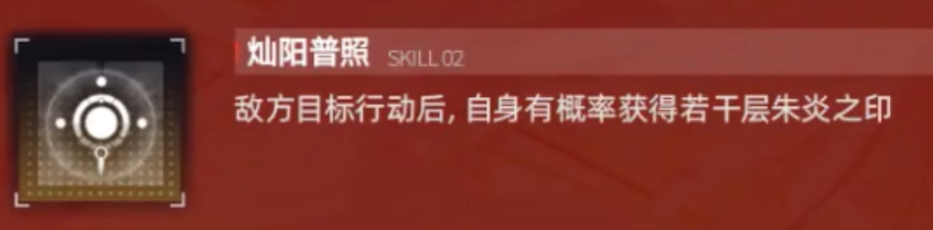 接下来是技能二【灿阳普照】。这一技能比较有策略性,它能在敌方目标行动后,给朝辉带来几层“朱炎之印”。这些印记对于朝辉来说非常重要,因为它们不仅能够提升她的攻击和防御力,还能为后续技能打下铺垫,增强她的整体输出能力。