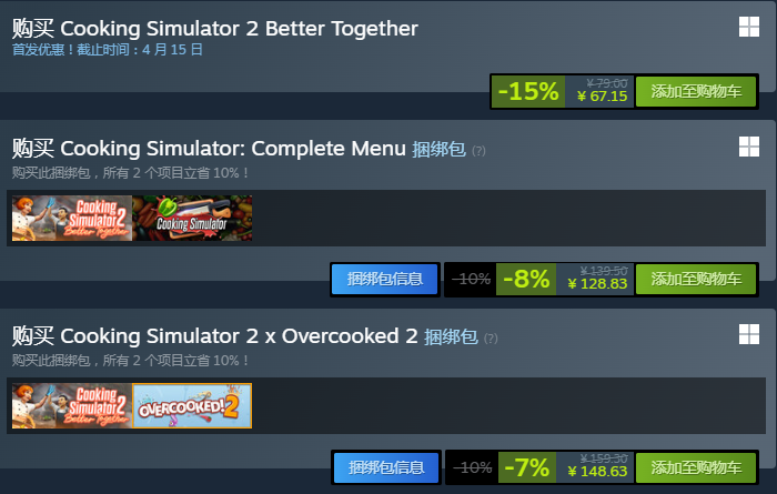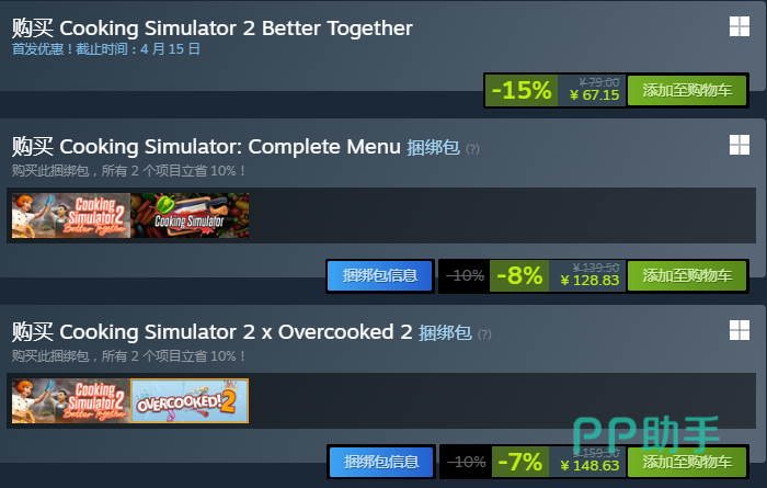 本作基础版官方定价为79元,现正开展限时特惠活动,直降15%后仅售67.15元,优惠截止至4月15日。除标准版本外,官方同步推出两款组合包:其一为《料理模拟器2》与初代作品的双版本捆绑包,享额外10%折扣,折后价为128.83元;其二为包含本作及另一款热门烹饪模拟游戏的双游合集包,同样享受10%优惠,最终售价为148.63元。用户可根据实际需求灵活选择。