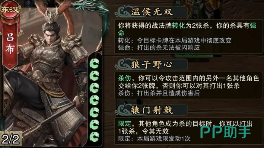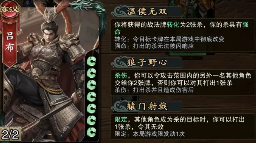 最后介绍的是吕布,这位武将在三大城池战中均有出场机会,但实际发挥受卡牌获取影响较大。若能获得【诸葛连弩】或专属武器【方天画戟】,其实力将跃升至顶级水平。“无双”技能允许其将一张战法牌转化为两张【杀】,且此【杀】无法被【闪】抵消;“狼子野心”则规定,每当其【杀】造成伤害时,可从攻击范围内角色处获得两张牌。凭借强大的掠夺与爆发能力,吕布在战场上往往能左右局势走向。
