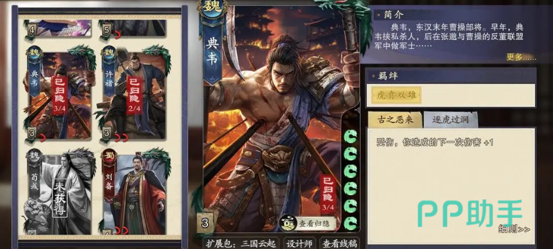 首先推荐的是典韦。在巨鹿城的战斗中,典韦担任城主时表现尤为突出。当他手中持有武器牌时,整体输出能力将大幅提升。“古之恶来”技能使其在受到【杀】造成的伤害后,下一次造成伤害时可额外+1点;而“逐虎过涧”则允许其弃置一张武器牌,并与一名队友交换身份。此外,若目标处于距离1以内,对该角色造成的伤害恒定为1点,这使得他在控场与配合方面极具价值。