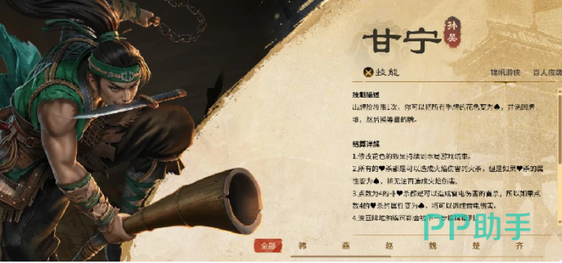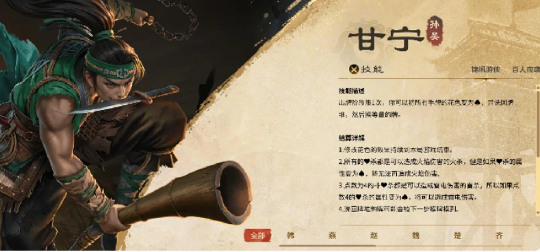 第三位推荐人选是甘宁。尽管他不适合担任城主,但在联军阵容中却能发挥极大作用。其“奇袭”技能要求使用黑桃牌才能触发,成功发动后可强制弃置一名其他角色的一张手牌。由于该技能更依赖外部支援与灵活走位,因此在联军作战中更具威胁性,尤其适合打乱敌方节奏、破坏关键资源,在团队协作中扮演突袭核心的角色。