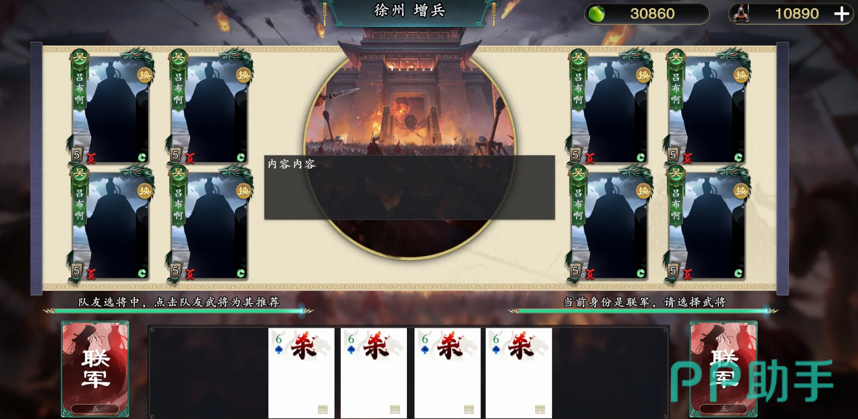 接下来是陆逊,同样是联军中的强力选择,也可视情况在荆州城出任城主。其“火烧连营”可在每回合对其他角色展示一张牌,若花色相同则继续传递并结算,当累计烧毁牌数超过3张时,还可追加1点伤害。另一技能则规定:若其在出牌后手牌数量为全场最少,即可额外摸一张牌。因此,当手中持有较多【闪】或【桃】等非攻击类牌时,反而能形成反向优势,实现稳定过牌与持续压制。