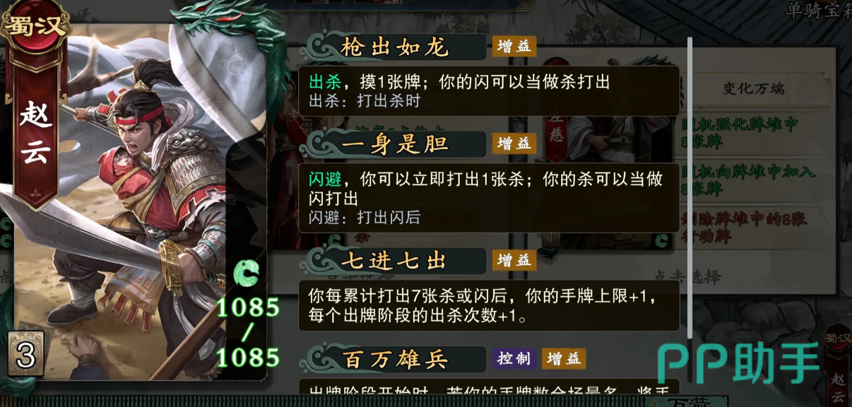 第二位值得信赖的武将是赵云,他适用于徐州与荆州的城池争夺战,并可胜任城主之职。“枪出如龙”让他在使用【杀】时额外摸一张牌,且手中的【沙】可视为【杀】打出;“以身试胆”则赋予其在使用【闪】后立即获得一张【杀】的能力,该【杀】亦可当作【闪】使用;而“七进七出”则规定每累计使用7张【杀】或【闪】后,手牌上限+1,同时其出牌阶段可多使用一次【杀】,持续输出与续航能力极为出色。