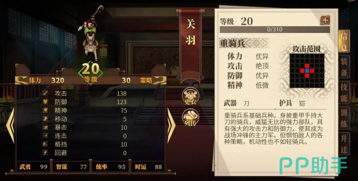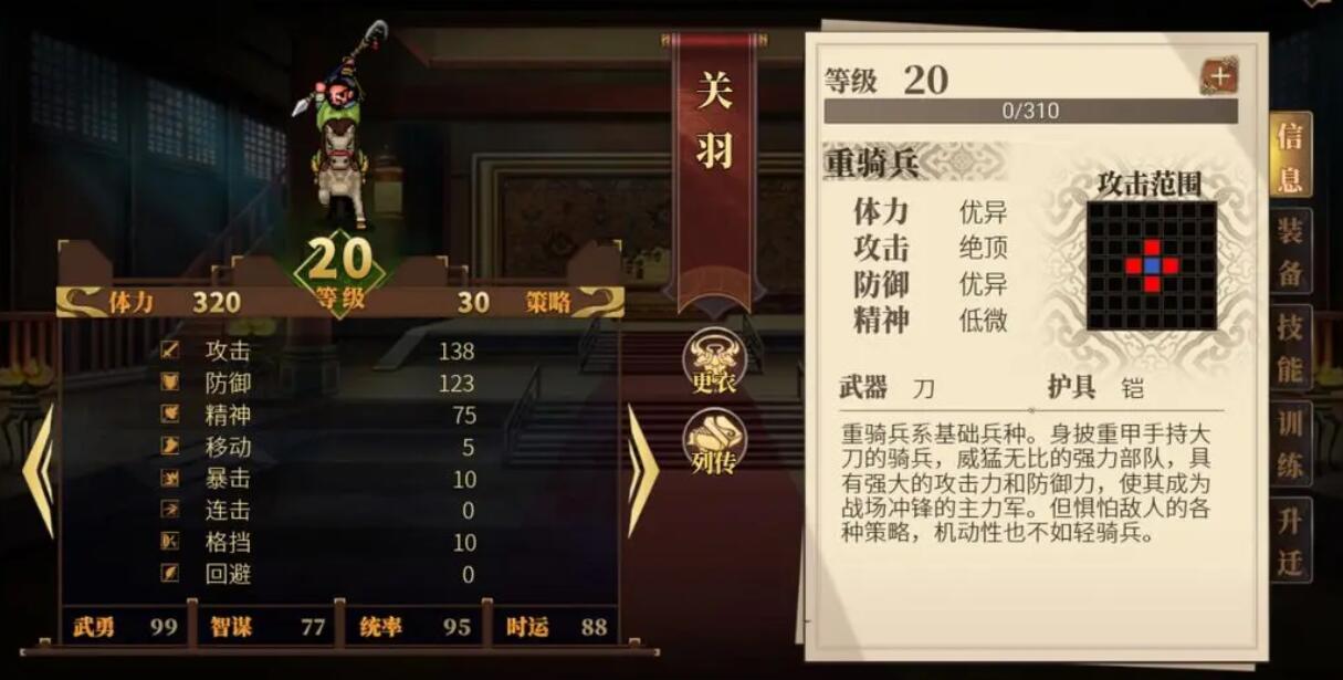 武将目前可以分为三个实战梯队:1、核心输出型:关羽(勇将路线)凭借青龙刀(暴击伤害+25%)与刘备的“鼓舞”技能联动,能实现单回合爆发清场,尤其在对抗重甲单位时破甲效率突出。赵云(山地骑兵)利用地形闪避加成(+15%)与涯角枪的奋战攻击特性,兼具机动性与多目标打击能力,但需注意其剧情离队风险。