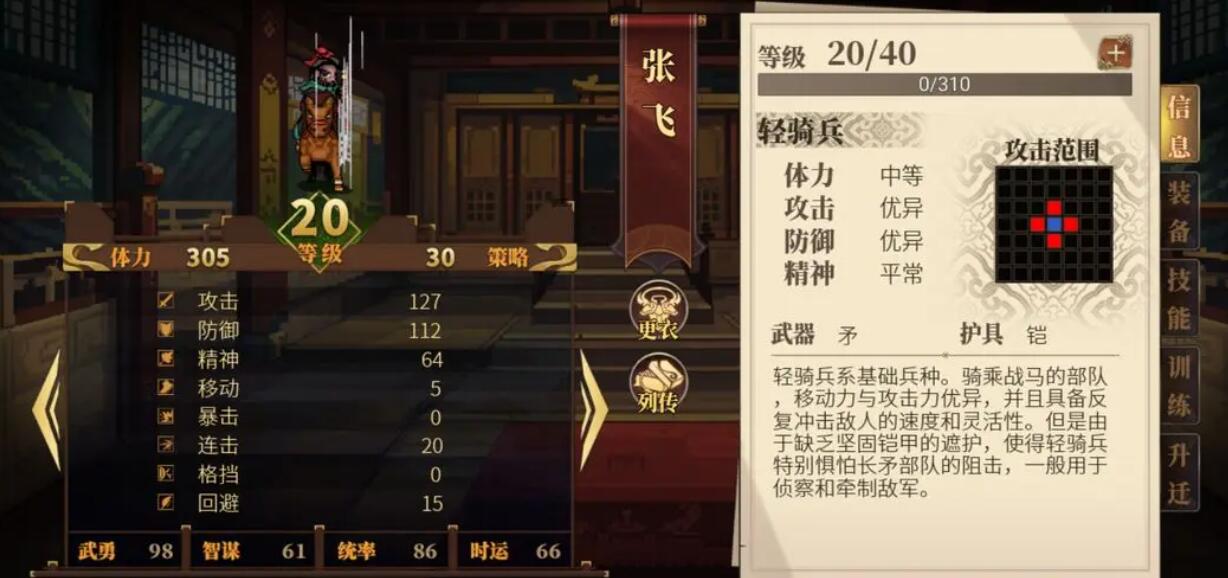 培养的话,优先培养张飞与刘备,利用张飞的高格挡建立防线,刘备通过仁德维持治疗。简雍在第二关解锁道士后,需快速提升智谋至80点以激活群体眩晕。中期关羽转职勇将并强化青龙刀暴击属性,赵云抢占山地地形执行绕后任务。此时需储备熟铁与精钢用于装备锻造,应对重甲骑兵+boss的混合攻势。