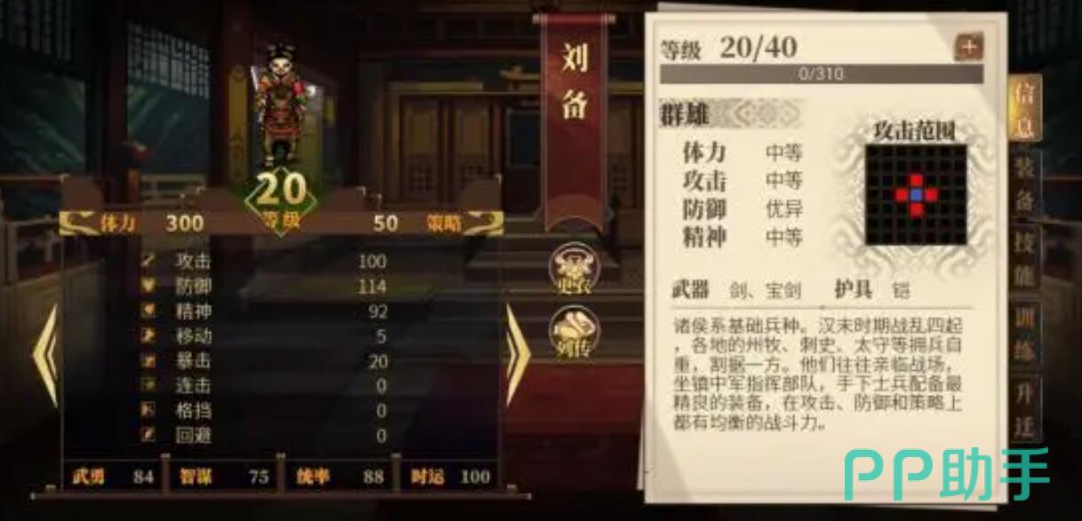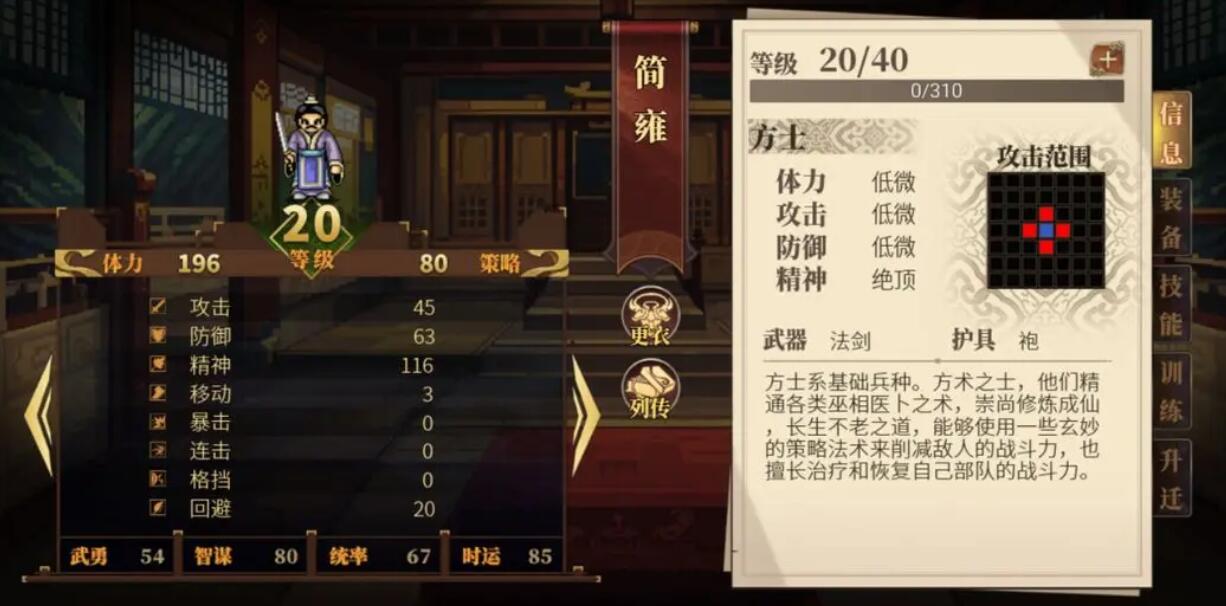 3、辅助功能型:简雍(方士)的群体眩晕与毒雾术能有效控制战场节奏,智谋值达80后解锁的控场技能为团队创造输出窗口。刘备(群雄)作为指挥核心,需优先提升统率至70点(防御+35)并装备铁鞭(破甲效果),兼顾生存与团队增益。
