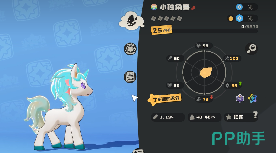 从基础数值来看,小独角兽各项成长参数处于同阶光系宠兽的中上水平。光属性本身具备机制优势,叠加其可进化的特性,使得前期资源投入具备明确回报预期。需注意的是,进化并非自动触发,必须满足特定前置条件方可激活进阶流程。