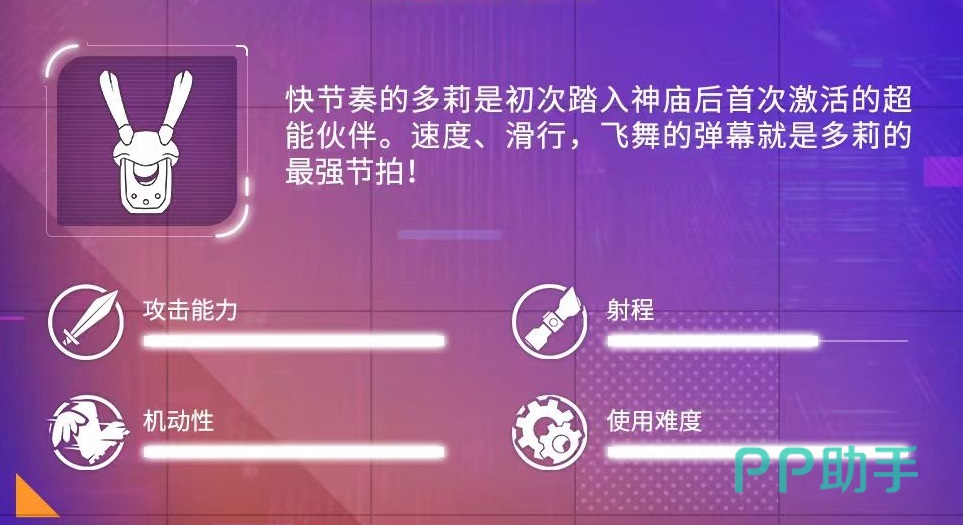 多莉在剧情设定中为神庙初启阶段即激活的先锋单位,其设计逻辑聚焦于“高速位移+瞬时输出”。基础属性呈现显著的两极分化:攻击强度与移动速度均达到当前版本角色梯队的顶端水平;射程处于中上区间(约28–32米有效压制距离);但操作容错率偏低,技能衔接与走位预判要求严苛。该角色并非面向入门玩家设计,建议完成至少3个主线章节并熟练掌握2名以上基础角色后,再投入资源培养。