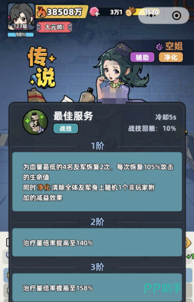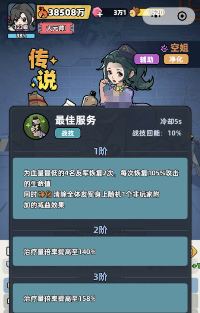 其主动技能【最佳服务】拥有仅5秒的冷却时间,释放后可自动识别并同时治疗当前血量最低的4名友方单位;该技能内置【自动净化】机制,可在治疗瞬间移除目标所受全部debuff,并同步触发短暂战力提升效果,在高压战斗节奏中实现“回血+解控+增益”三位一体支援。