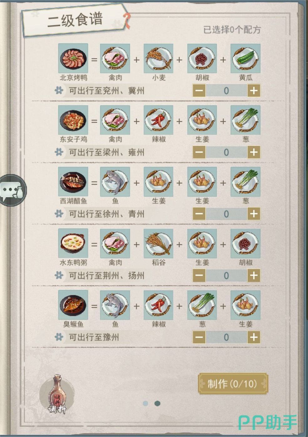 然后就是难一点的食谱了,像姜丝酱需要生姜、葱,而烤鱼的配方则需要是鱼、胡椒、辣椒、芝麻,酒糟鱼和西湖醋鱼需要的分别是稻谷、芝麻、鱼、辣椒和鱼、生姜、生姜、葱,这些配方需要的食材和烹饪方式相当来说比较复杂,但是会有更好的食物效果哦,感兴趣的小伙伴们可以去其中试试看。