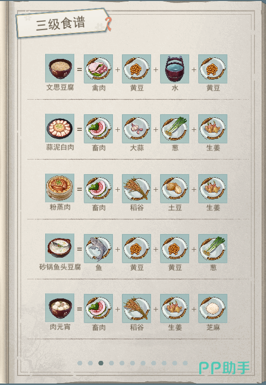 有信心的小伙伴们可以试试三级食谱,文思豆腐的是禽肉、黄豆,最后的砂锅鱼头豆腐和蒜泥白肉则要畜肉、鱼、黄豆、葱和畜肉、大蒜、葱、生姜,这些就需要更高的烹饪技巧和和食材搭配了,但是相对来说这些食物对大家来说帮助也是最大的哦,