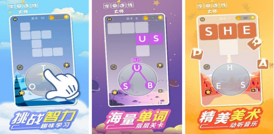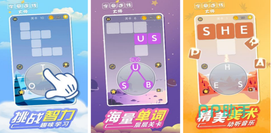 现在很多小孩子在刚刚上幼儿园时,就开始学习英语,而这款游戏就是将英语单词以及英语字母组合在一起,玩家要通过滑动屏幕的方式,将相应的单个英文字母连接在一起,组建成正确的英语单词,精美的画面再搭配上特别愉悦的背景音乐,比较挑战孩子的智力。
