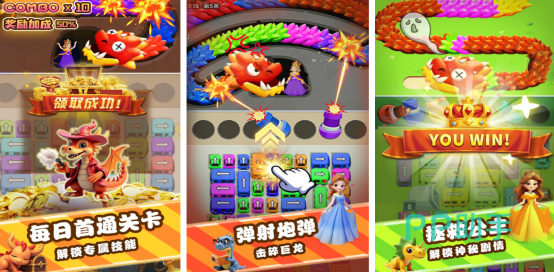 色彩缤纷的卡通画面,在这里将会看到很多颜值超高的公主角色,玩家在游戏中将要化身成为神炮手,因为这些公主被敌人所囚禁,而玩家要通过发射炮弹的方式将所有的神龙鳞片全部消除,以此才能成功拯救公主。其实从整体的玩法上来看,和泡泡龙以及祖马等多种玩法都特别相似,可通过闯关的方式解锁更多神秘的故事剧情。