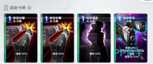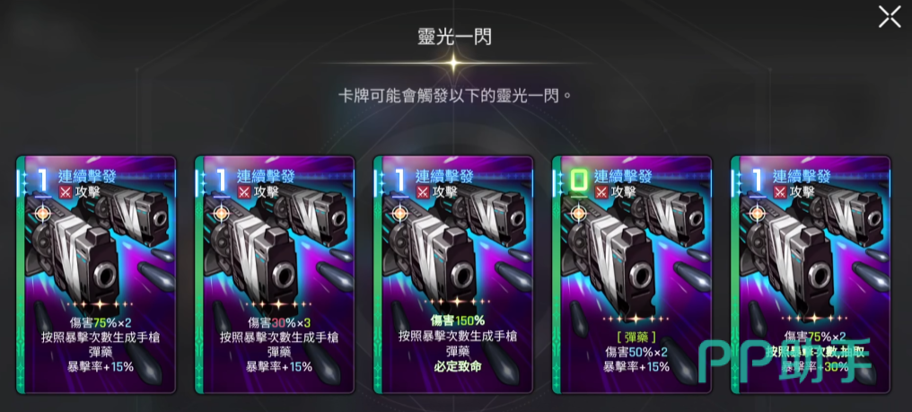 最后一张卡本应定位为强化类技能,若作为可重复使用的攻击卡,则生存能力将进一步提升。“魔眼乱舞”是一张一费攻击卡,根据本回合已使用的弹药数量,进行相应次数的50%伤害打击,适合作为爆发手段。灵光一闪后,第二张改为按本回合使用攻击卡数量判定;第三张减少费用;第四张则根据弹药卡使用次数提供50%数值的护盾,实用性更高,战术灵活性增强。此外,“必杀弹”为一费技能卡,即使仅提升40%伤害,也具备爆发潜力。