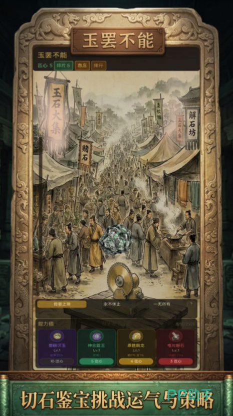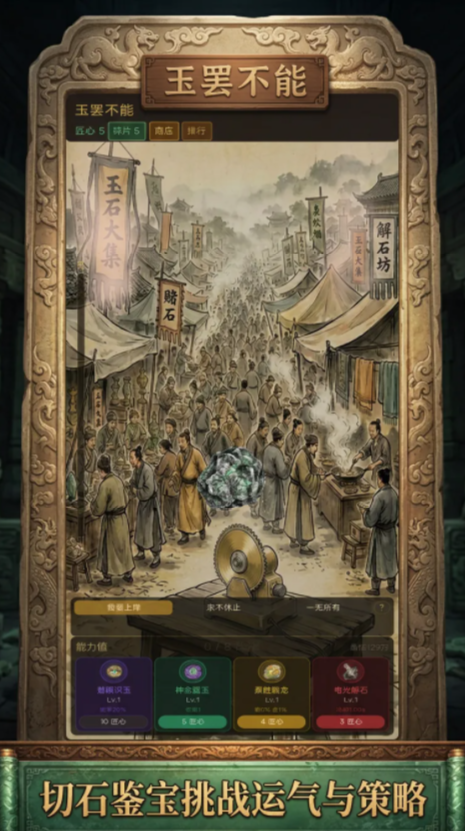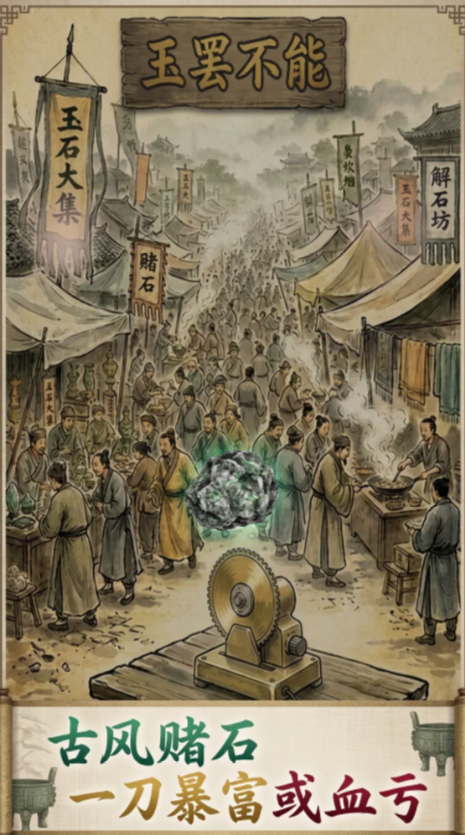 在影视作品中屡见不鲜的赌石情节,正悄然走进手游世界——《玉罢不能》以古风经营+策略切割为核心,打造沉浸式玉石鉴赏体验。玩家将化身赌石坊主理人,在竖屏界面中亲手执刀,通过精准角度选择与时机判断,剖开原石表皮,揭晓内里真容:或是一块价值连城的翡翠璞玉,或是毫无价值的普通石料。成败一瞬,既看眼力,也考决断。