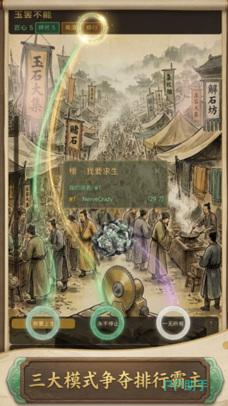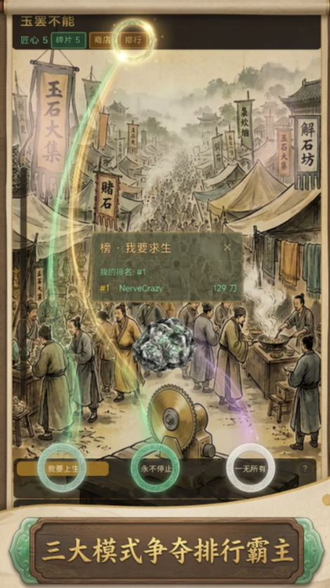 游戏中配备四大专属技能系统,可在切割前激活,辅助识别石料内部玉质分布、裂隙走向与色带位置。每次成功切割后,系统自动发放宝箱奖励,内含稀有道具、属性加成材料及外观装饰等资源。尽管操作门槛低,但深度策略性贯穿全程——全球排行榜实时更新,支持与世界各地玩家比拼切割精度、玉石估值与综合收益。