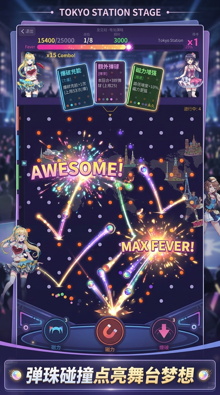 游戏以“弹珠轨迹控制+音乐节奏判定”为双核心驱动,玩家将扮演专属控台师,在动态变化的舞台装置间引导弹珠碰撞,触发对应节拍点位。每一次弹射均需兼顾物理落点预判与音频波形同步,形成独特操作反馈闭环。舞台光影随演奏实时演化,配合角色舞蹈动作与特效节奏,构建高辨识度的视听语言体系。