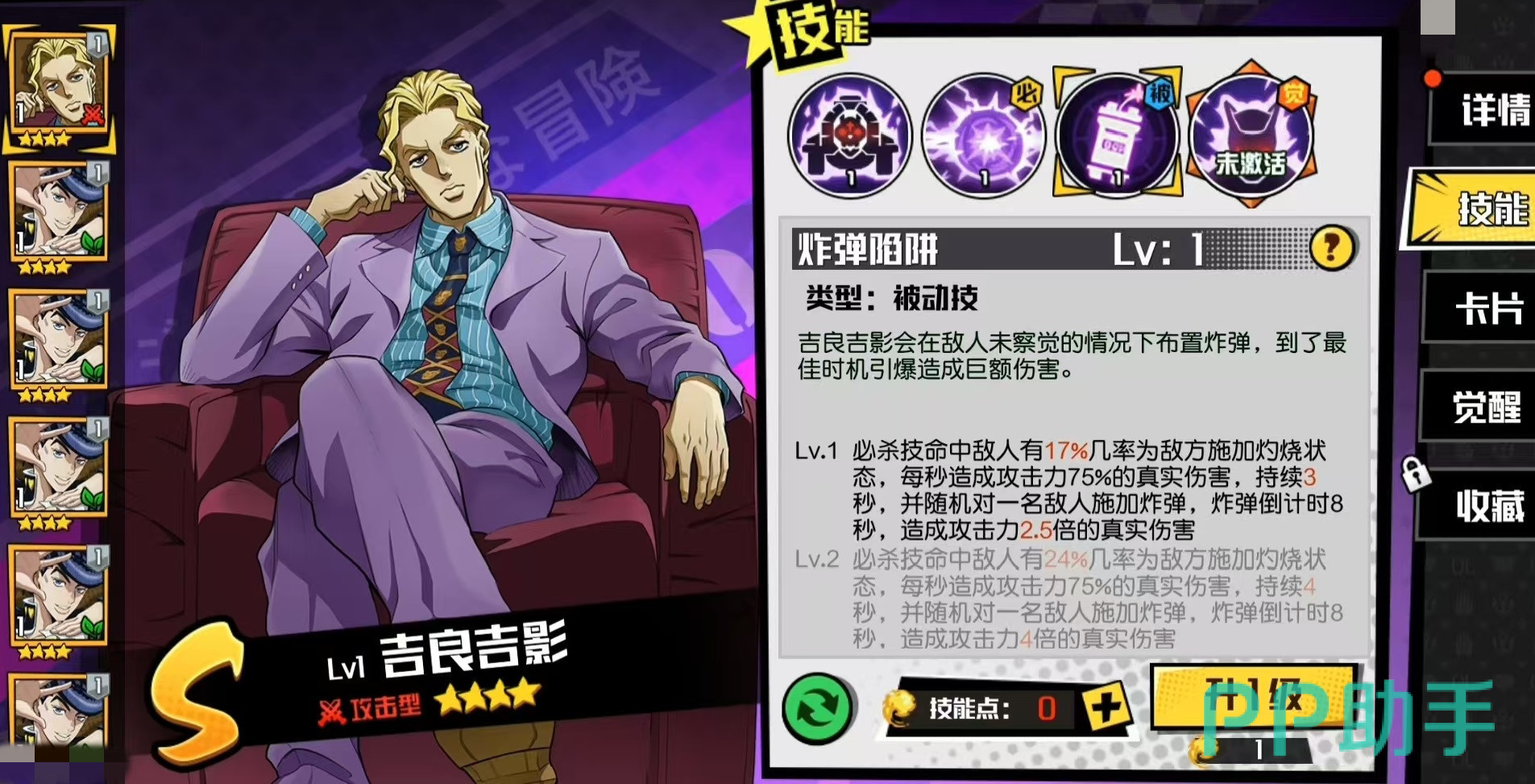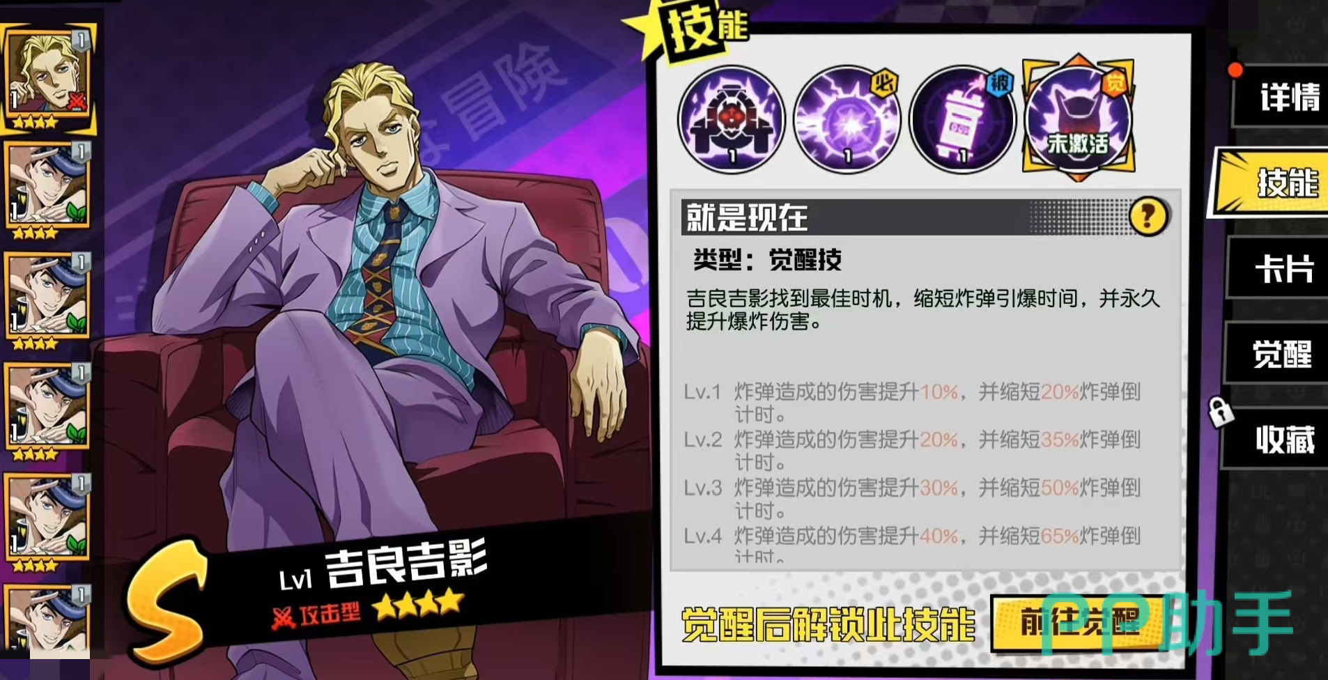 首先来看他的觉醒技能,该技能允许吉良吉影在合适时机提前引爆已布置的炸弹,并永久提升后续爆炸所造成的伤害。随着技能等级的提升,不仅总伤害增强,炸弹倒计时缩短的比例也会逐步增加,进一步提高战斗节奏和爆发窗口。