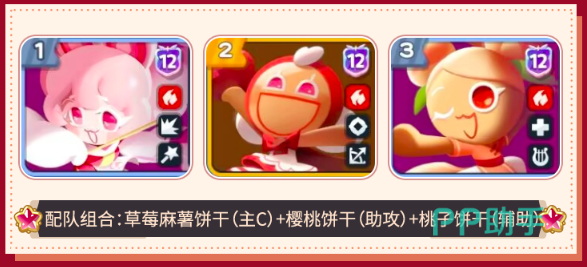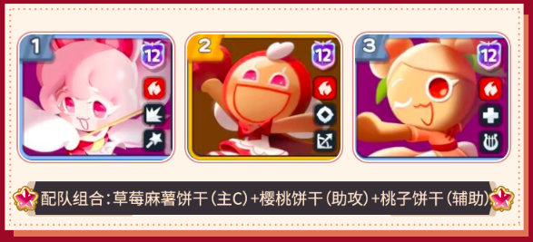 火系万能适配阵容:草莓麻薯、樱桃、桃子。该组合突出“多段伤害+状态联动+资源复用”优势,泛用性极强,既可应对高防Boss也可高效处理杂兵集群。草莓麻薯作为主C,其召唤物可继承桃子提供的攻击力加成,并在樱桃点燃的灼烧环境下触发额外伤害判定,形成环环相扣的输出链;樱桃负责施加持续灼烧与易伤效果,扩大整体伤害覆盖面;桃子则稳定提供全队攻击强化,增强技能倍率与普攻收益,三者配合达成速战速决的战术目标。