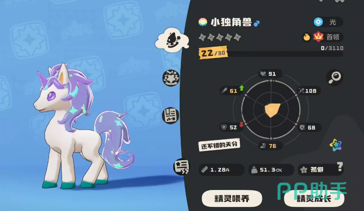 这个独角兽前期的能力比较弱,但是等到后期变成白金独角兽之后,就可以拥有多种不同的技能,比如可以利用偷袭这项技能对敌人发起进攻,另外也可以借助先发制人这个技能,快速出招,制衡对手,相对来说是比较厉害的,虽然整体的防御能力比较弱,但是却是一个优秀的输出类精灵,比较喜欢光系精灵的可以着重去培养小独角兽。