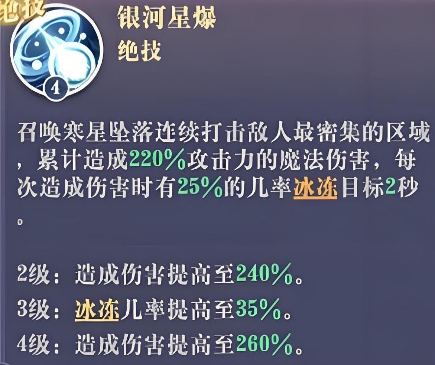 她的终极技能为全体范围伤害,基础倍率为260%,具备显著AOE清场能力;同时附带35%概率冰冻敌人,虽单次触发率非100%,但因作用于多个目标,在高频战斗场景中控场覆盖率可观。该技能兼顾输出压制与节奏打断,是应对群怪或关键敌方前排的核心手段。