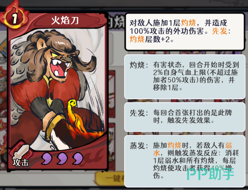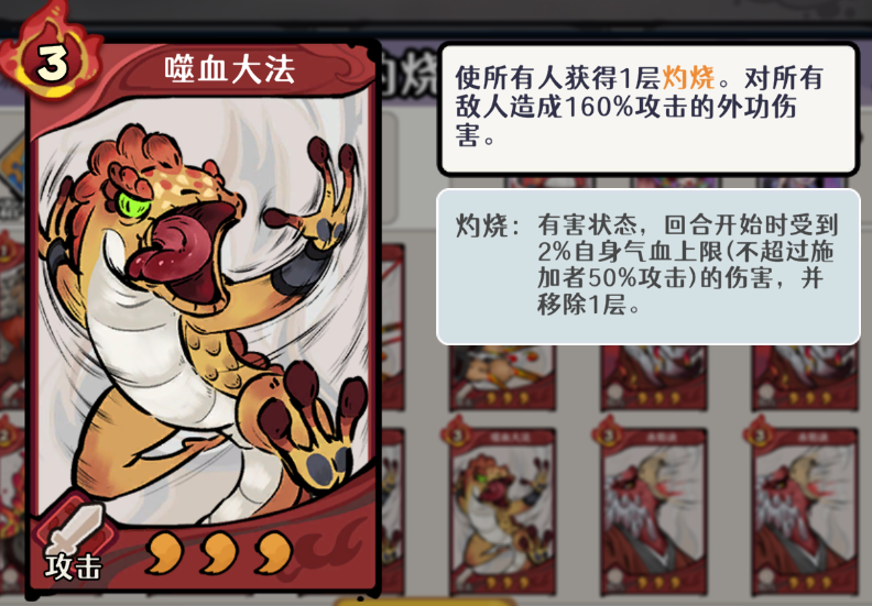 角色职能分工明确:舞狮者承担前排抗压职责,其真气与专属卡均可稳定施加灼烧;弦音龙女定位为功能型辅助,除自身灼烧能力外,还可提升全体友方伤害,并具备灼烧牌发现效果,显著提升关键卡牌命中率;噬血大法作为特殊机制卡,可为敌我双方全体单位附加1层灼烧,该特性可联动赤焰诀触发减速效果,进而实现“一怒抽牌”,同时激活七星拳类增益技能,形成多段伤害补充。该联动链大幅增强流派的节奏主动权与战术延展性。
