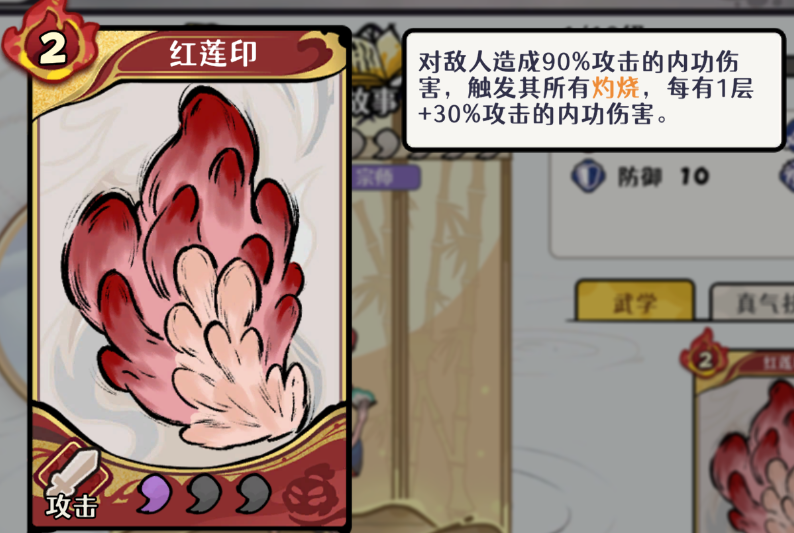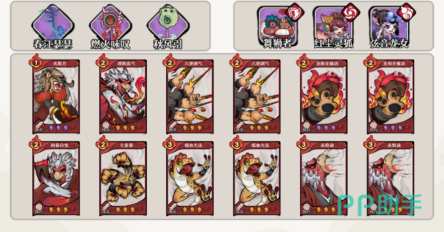 阵容配置上,主力武侠选用舞狮者、红尘灵狐与弦音龙女,形成攻防辅三位一体结构。神兵组合为春江瑟瑟、燃火咏叹、秋风吟,侧重怒气调控与手牌调度。卡组核心包括火焰刀、纯阳真气、六绝剑气、噬血大法、至阳无极功、赤焰诀、阳春白雪七张卡牌,整体围绕灼烧施加、层数堆叠与资源续航三大目标设计。其中红尘灵狐为绝对核心输出位,其【红莲印】技能每层灼烧额外提升固定内功伤害,叠加效率直接决定最终爆发上限。常规操作链为:先手铺灼(火焰刀/纯阳真气)→ 中期续层(六绝剑气/赤焰诀)→ 怒气充足时启动【红莲印】完成清场。