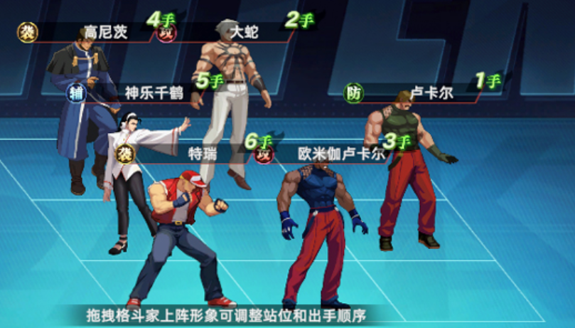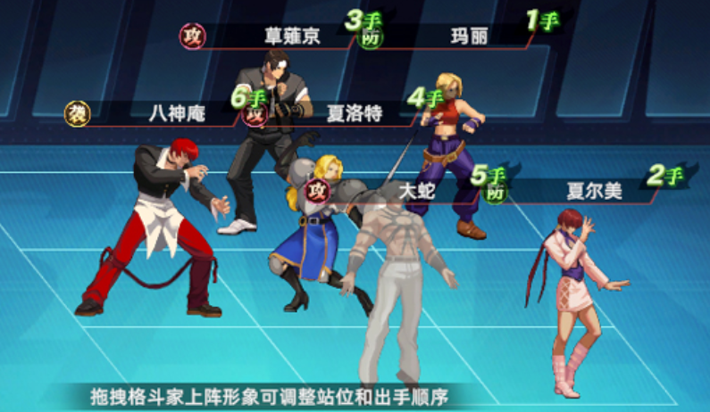 角色设定严格遵循原著职业定位:如草薙京属爆发型火系格斗家,八神庵为高机动暗影系,不知火舞则具备控场与位移双重特性。每位角色拥有独立成长树,涵盖技能等级、必杀技解锁、EX招式强化及队长技适配等维度。战斗采用三段式场景切换机制,镜头随战况动态推进,配合帧数级动作捕捉,实现踢击滞空、投技破防、超必杀震屏等硬核表现。