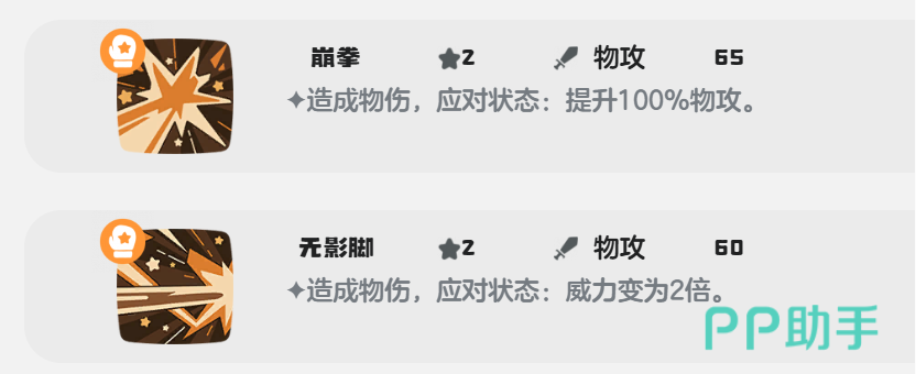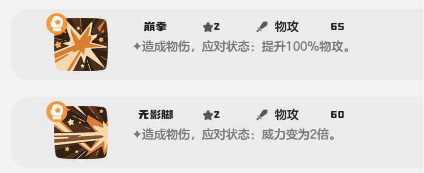 初始物理伤害60点,战斗时无影脚的威力会增强2倍。