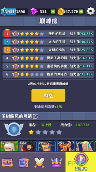 另外在游戏里还有巅峰榜的玩法,所有成员都可以在巅峰榜中不断战斗,证明自身的能力,每一局战斗都会有相应的战力值呈现,玩家在三天之内有5次参与对战的机会,会根据实际的战力数值呈现在榜单上,想证明自己能力的,可以加入到巅峰榜对抗中,利用各种不同的英雄能力,辅助自己参与对抗。
