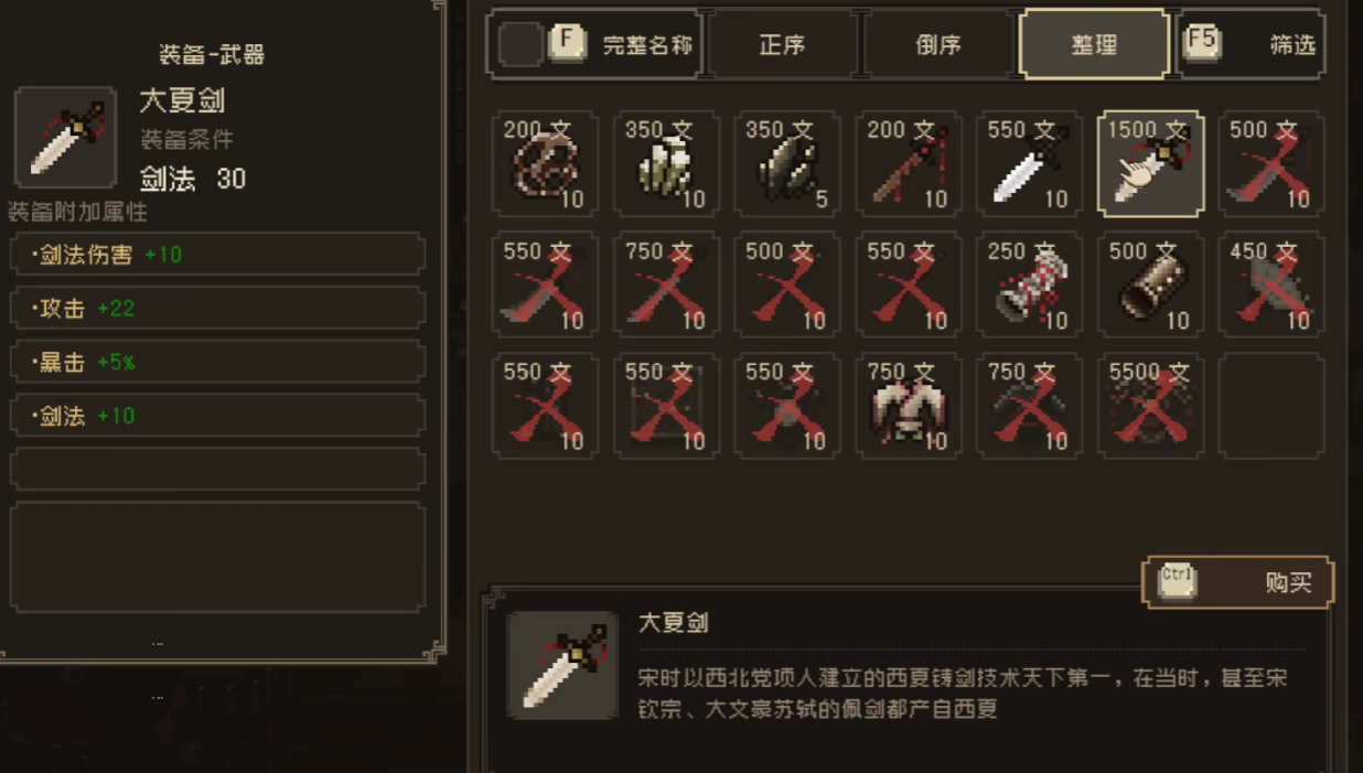 大夏剑的价格为1500文,但是刷新概率较低,倘若玩家看到这个装备,直接购入即可。